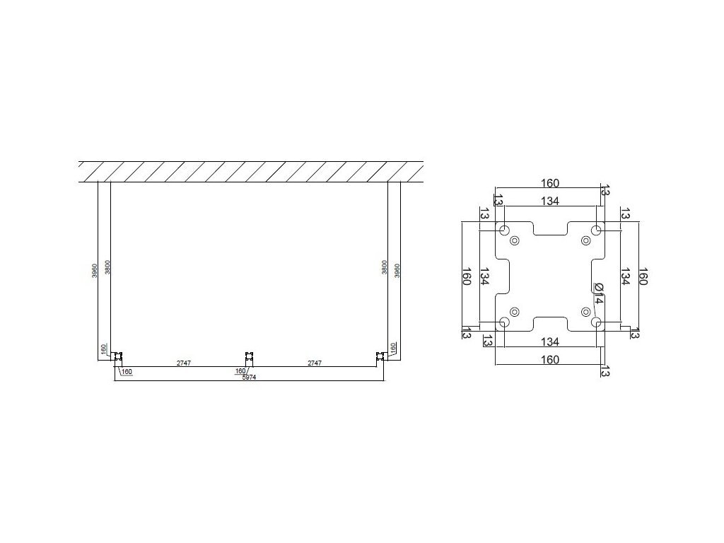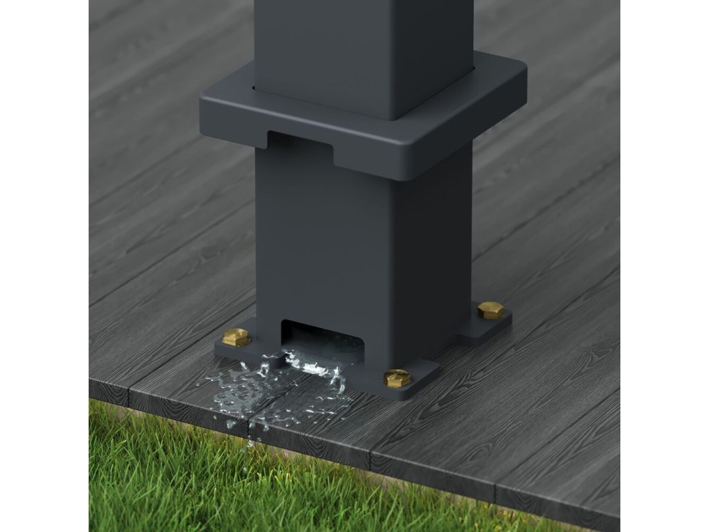 Robustní sloupek má rozměry 116x116 mm, při instalaci je zapotřebí počítat s patkou sloupku o rozměrech 160x160 mm. Patka je z 8 mm silné oceli a je navíc zakryta hliníkovým krytem (165x165 mm) s integrovaným drenážním systémem. Vyvýšený hliníkový profil s přidanou horní lištou ukrývá lamely tak, že z bočního pohledu nejsou viditelné a jsou v jedné linii s profilem.