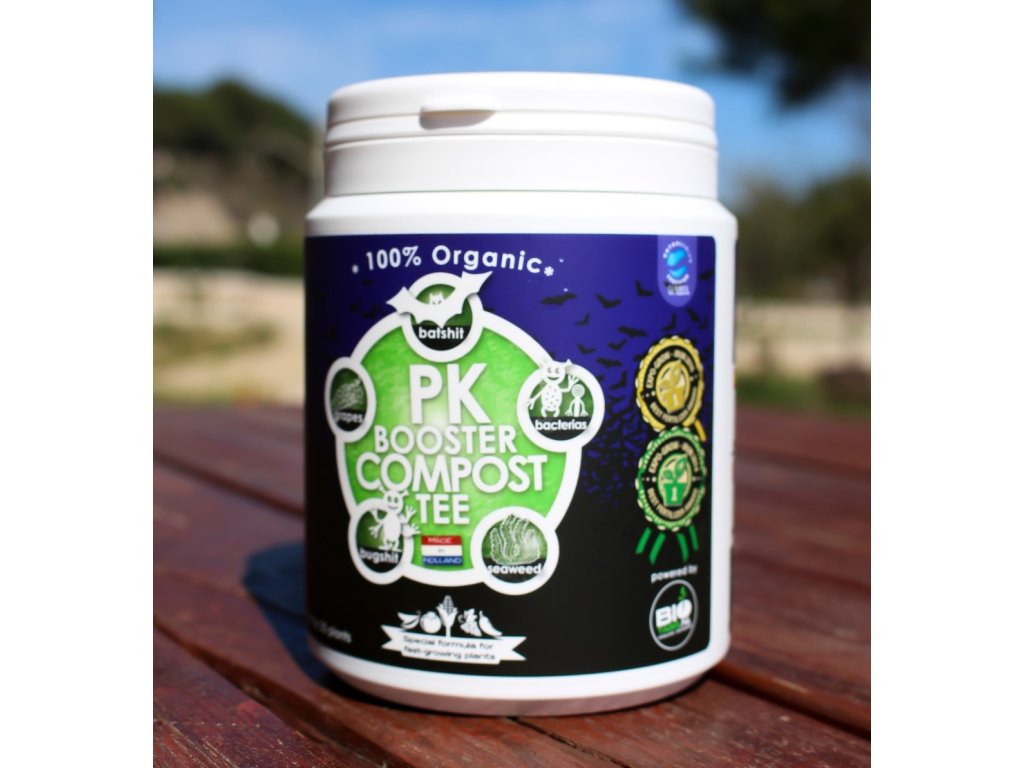 Koncentrovaný organický kompost Biotabs PK Booster Compost Tea je vhodný pro indoor i outdoor pěstování bylinek. Kromě netopýřího trusu je součástí extrakt z mořských řas a hlavně užitečné bakterie. Tyto bakterie uvolňují fosfor a draslík. Biotabs Compost Tea se míchá s vodou v poměru 15 gramů na 1 litr vody bez chlóru. Nepoužívejte chlorovanou vodu, chlór zničí prospěšné organismy. Do zálivky doporučujeme přidat i 5 ml Biotabs Orgatrex.