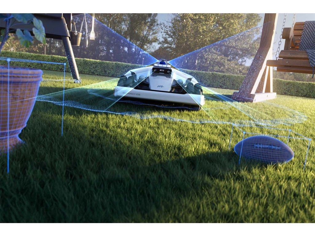 Vytváří 3D mapu zahrady s vysokou hustotou bodů a dokonale rozpoznává prostředí zahrady v reálném čase a umožňuje inteligentní plánování trasy sečení. Pohon všech kol si snadno poradí se sklonem svahu až 80% (38°). Přední odpružená kola překonají překážky na trávníku do velikosti 50 mm.