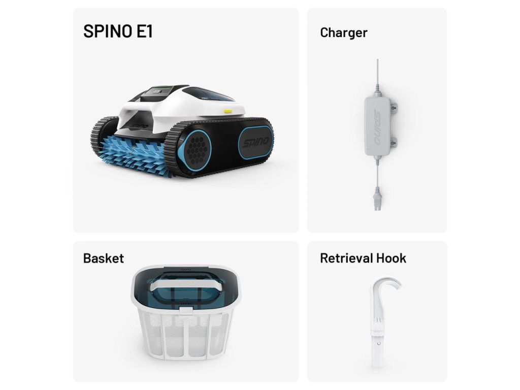 1x SPINO E1 robotický bazénový vysavač 1x nabíjecí adaptér 1x hák 1x návod